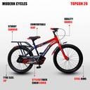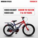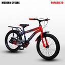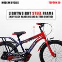 The MODERN Topgun 20T Kids Cycle is the ultimate kids cycle built for fun, freedom, and everyday road adventures. Designed for boys aged 7-10 years, this 20T cycle features a stylish dual tone Red & Navy Blue look, rear-side FLYING MUDGUARD, and a comfy PU saddle heavy duty seat. It's safe, sturdy, and comes 85% assembled – just fix and ride. Whether you’re upgrading from a kids cycle 2/3 years or looking for a durable cycle for kids boys, this MODERN CYCLE is the perfect fit. Ideal for parks, streets, or just daily fun – ride Topgun, ride proud!Ride towards a healthier lifestyle with this stylish and durable cycle designed for smooth and comfortable rides. Made with a sturdy steel frame, this cycle ensures stability and long-lasting performance while maintaining a lightweight structure for easy handling. It features anti-skid pedals, soft-grip handles, and a comfortable saddle that can be adjusted according to your height, providing an ergonomic riding experience. The high-quality tyres offer excellent grip and control on various terrains, making it perfect for daily commuting, exercise, or leisure rides. With an efficient braking system, it ensures safety on roads and rough paths. Easy to assemble and maintain, this cycle is ideal for kids, teenagers, and adults looking for an active lifestyle. The sleek design and attractive color options add to its appeal, making it a perfect gift for your loved ones to encourage outdoor activities and fitness while enjoying a fun riding experience.