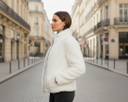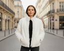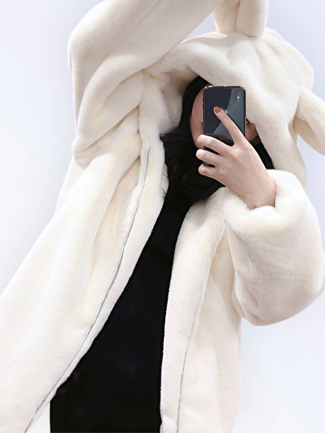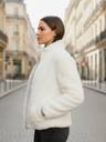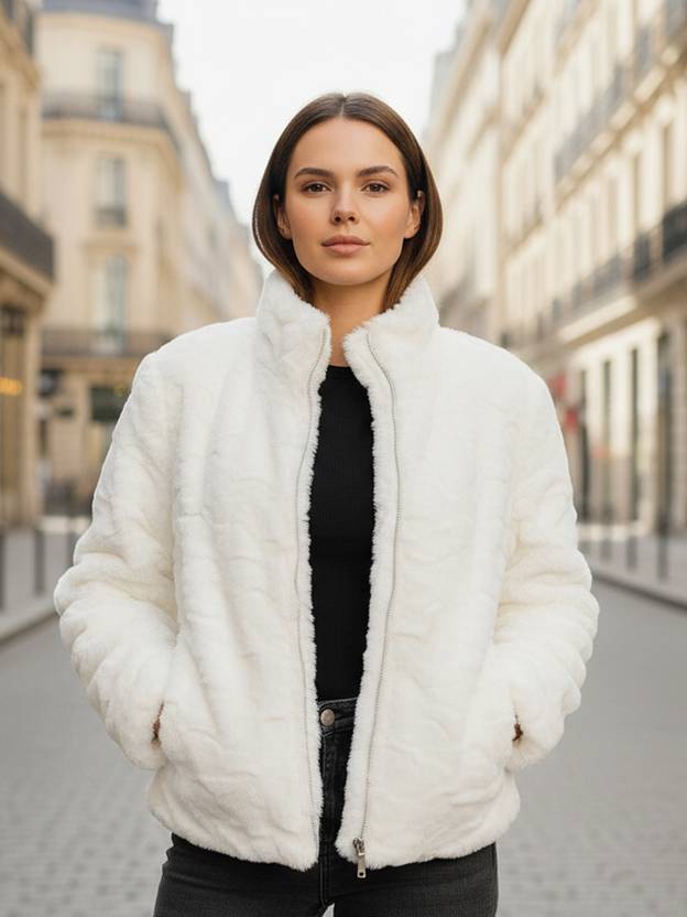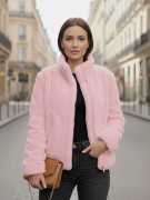 This jacket is a plush, faux fur design. It features horizontal ribbed detailing across the body and sleeves, giving it a textured look. It has a high stand-up collar and a silver-toned front zipper closure. There are also two side pockets, and the overall fit appears comfortable and slightly relaxed.