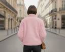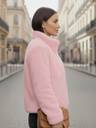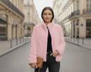 This jacket is a plush, faux fur design. It features horizontal ribbed detailing across the body and sleeves, giving it a textured look. It has a high stand-up collar and a silver-toned front zipper closure. There are also two side pockets, and the overall fit appears comfortable and slightly relaxed.