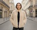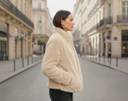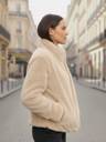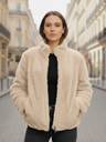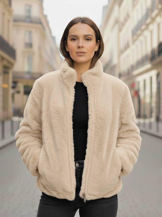 This jacket is a plush, faux fur design. It features horizontal ribbed detailing across the body and sleeves, giving it a textured look. It has a high stand-up collar and a silver-toned front zipper closure. There are also two side pockets, and the overall fit appears comfortable and slightly relaxed.