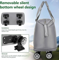 Equipped with a removable, silent bottom wheel system, this travel bag combines smooth rolling with the option to convert it to a non-wheeled format. For installation, you can insert the wheel sheath part firmly into the bottom slot. For removal, press down on the wheel’s sheath and push it forward into the groove. This facility adds a flexible way to use this bag in different settings, whether you're rolling it through terminals or carrying it folded and compact.
