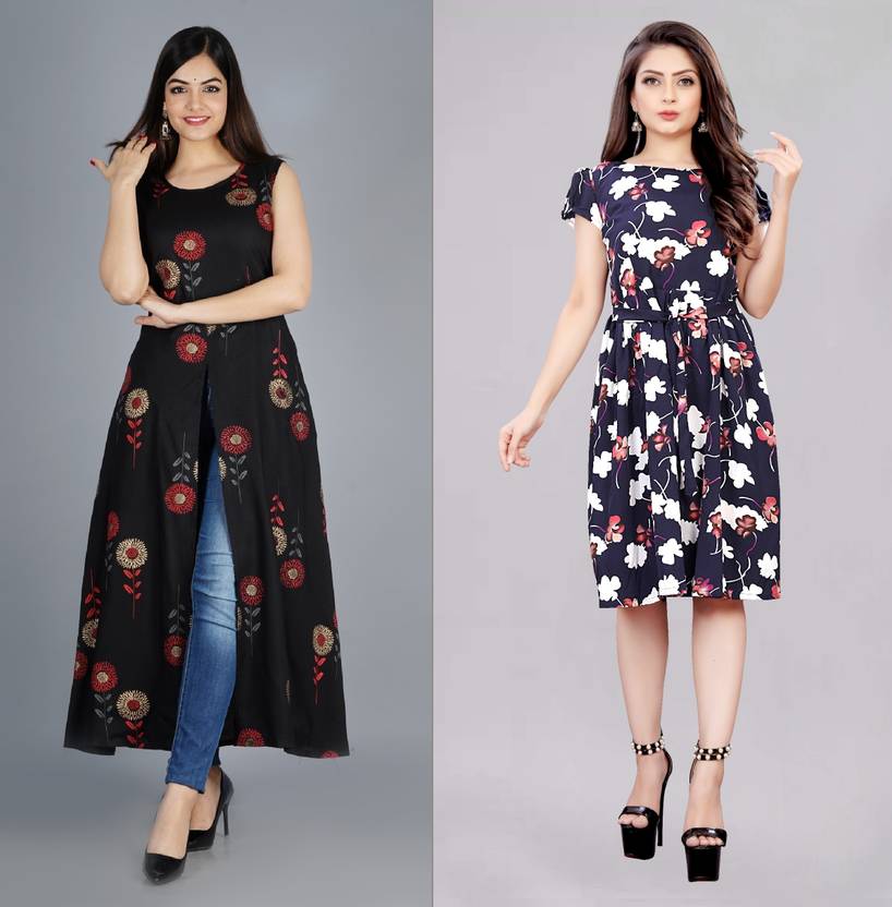 A good quality dress for women. It will give them a classic and trendy look.This is designed as per the latest trends to keep you in sync with high fashion and with wedding and other occasion, it will keep you comfortable all day long. The lovely design forms a substantial feature of this wear.This is floral printed western knee length dress which is made of fine quality crepe fabric and also it is stitched as western look. belt which is create tredy look on your outfit. floral printed western anarkali flared dress has printed and flared dress is available it can wear causual, party, function etc it is unique in pattern and sleeveless (short sleeve attached inside) is available fabric is soft so it is comfortable to all day. we have also manufacture wester wear dress dress , printed dress , floral printed dress , floral printed Dress , one piece dress , skater dress ,dress , combo western dress , frock dress , checked western dress , striped wetern dress , party wear dress , casual gown, party wear gown , floral printed gown , striped dress , digital dress , striped dress , casual dress , daily wear dress , regular dresses at low price so please visit our store for more collection