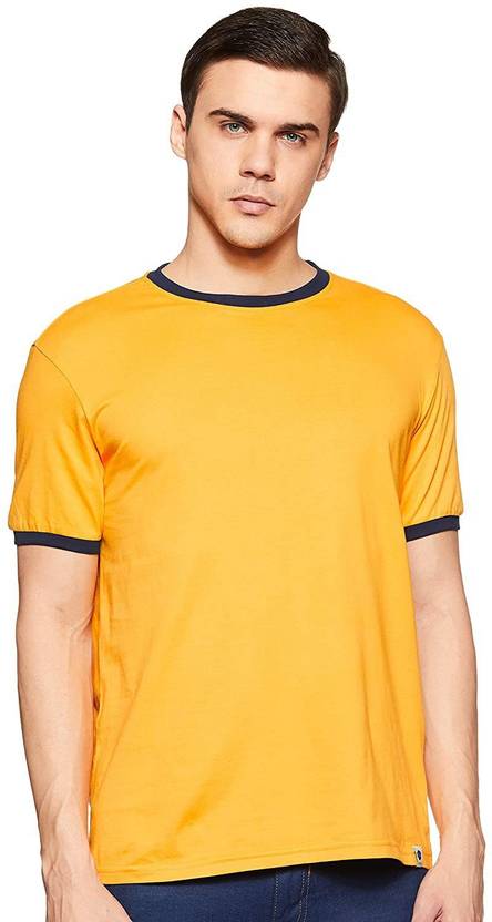 Men Solid Round Neck Cotton Blend Yellow T-Shirt