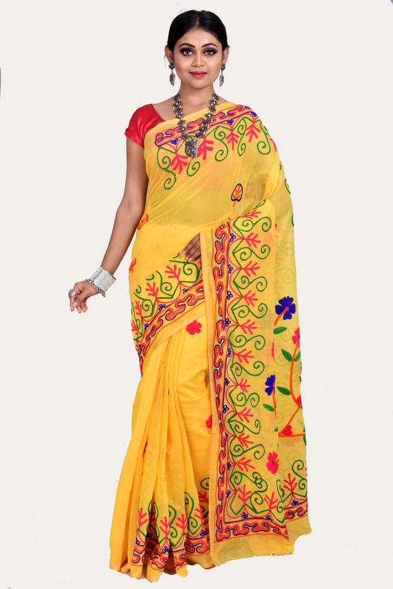 Embroidered Banarasi Pure Cotton Saree (Yellow)