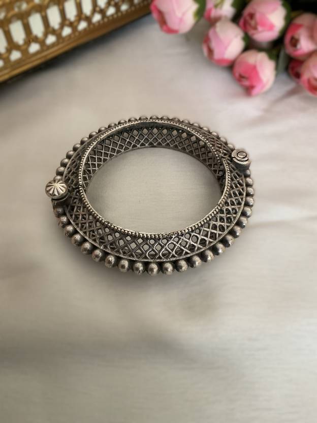 This openable silver-plated oxidised kada by Mohati Jaipur is crafted from high-quality brass with a striking lattice cutwork design and bold dotted detailing along the edges. The oxidised silver finish gives it an antique appeal, while the openable clasp ensures easy wear and a secure fit. A versatile statement piece, this kada beautifully complements both ethnic ensembles and Indo-fusion looks.