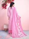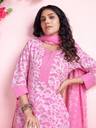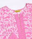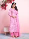 Epitomise effortless style by opting for this pink kurta set from MOJILAA. The kurta flaunts a round neck, three fourth sleeves, floral block print and gota patti embellishment for added charm, which comes with chevron printed partially elasticated mid-rise palazzo and floral printed dupatta. Make a style statement by adding heels and bangles to complete the look.
