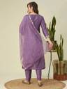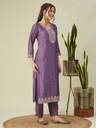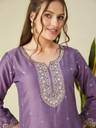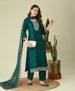 Elevate your ethnic look with this straight kurta set crafted from a rich silk fabric. The kurta features intricate zari and sequin embroidery on the neckline, hem and sleeves, paired with a beautifully scalloped and embroidered organza dupatta and matching pants. Designed with a keyhole neckline and 3/4th sleeves, this festive wear suit set offers both comfort and style. Perfect for weddings, parties and traditional functions, this set adds a touch of royalty to your wardrobe. Style it with heels and statement jewelry for a complete ethnic ensemble.
