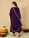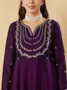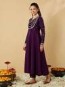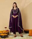 Enhance your festive look with this stunning embroidered Anarkali kurta set for women. Made from premium silk fabric, it features a beautifully flared Anarkali kurta with intricate zari embroidery, 3/4 sleeves and a notched round neckline. The set comes with matching straight pants and a heavily embroidered dupatta with scalloped lace border, creating a regal ensemble. Ideal for weddings, parties and festive occasions, this stitched ethnic suit set offers a luxurious feel, elegant silhouette, and comfortable fit. Flaunt timeless elegance with this teal blue ethnic wear set.