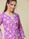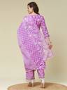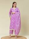 Look elegant and festive-ready in this beautifully embroidered kurta set for women. Crafted from soft cotton fabric, the set includes a floral printed straight kurta with keyhole neckline, 3/4 sleeves and lace-trimmed hem, paired with a matching printed pant and a flowy dupatta. The calf-length kurta and regular-fit pants ensure comfort and style, perfect for festive occasions, wedding functions, and party wear. Detailed floral patterns, scalloped lace borders, and vibrant violet color make this ethnic set a standout addition to your wardrobe.