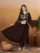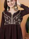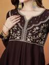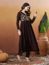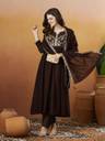 Anarkali suit with flowy silhouette, Intricate golden zari floral embroidery on bodice, Matching straight-fit pants for a complete look, Dupatta with embroidered lace border and scattered buti work ,Soft, comfortable fabric with a graceful fall , Suitable for festive, wedding, and party wear ,Styled with statement earrings and golden clutch for elegance