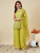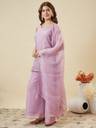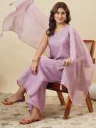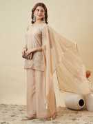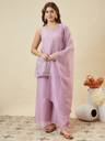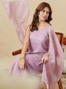 Elevate your festive wardrobe with this elegant sleeveless kurta set. Beautifully adorned with delicate thread and sequin embroidery, this outfit comes with matching sharara and a graceful dupatta. Made from soft, breathable fabric for all-day comfort. Additional sleeves are provided inside for versatile styling. Perfect choice for festive celebrations, parties, or special occasions.