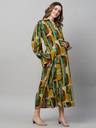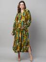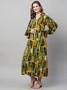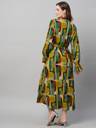 The calf-length design of the dress provides an elegant and flattering silhouette, offering ample coverage while allowing for ease of movement. The geometric print adds a trendy and modern touch, giving the dress a chic and fashionable appeal that suits any occasion.