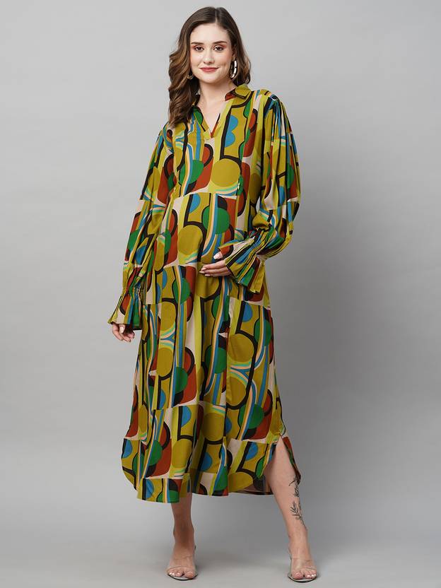 Crafted from high-quality rayon fabric, known for its softness and breathability, this dress offers utmost comfort for your changing body. The fabric is gentle on the skin and allows for easy movement, accommodating your growing belly and providing a comfortable fit throughout your pregnancy.