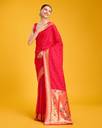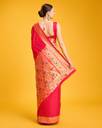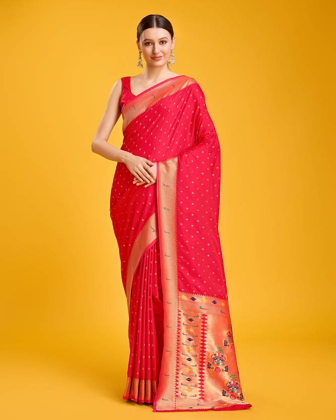 Indulge in the timeless elegance of our Paithani Banarasi silk saree, a masterpiece that seamlessly merges the rich heritage of Paithani with the opulence of Banarasi silk. Handwoven with meticulous attention to detail, each saree is a work of art, reflecting centuries-old weaving techniques passed down through generations. The intricate zari work adds a touch of shimmering splendor, enhancing the allure of every drape. Experience the epitome of luxury and sophistication with our Paithani Banarasi silk sarees. The rich golden zari border and pallu add a royal touch to this traditional attire, making it perfect for weddings, engagements, receptions, pujas, festive celebrations such as Diwali, Durga Puja, Karva Chauth, Navratri, and Ganesh Chaturthi, Onam, Pongal, Chhath pooja, Teej, as well as other special occasions and cultural events.