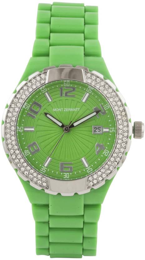 Brought too you from the house of D'SIGNER MONT ZARMATT Analog watches are quartz movement with manufacturer's warranty at affordable prices.case style:watch,with a round shape,Studded with Stones.has a stainless steel. dial style:round shape dial color Green,with a date window at 3.in the surface,feature: A Screw at the position of 3 to reset the time. strap style,Green Plastic strap it has a Plastic strap which gives you a comfort in wear secured with a tang clasp water resistant up to 30 m. warranty: 1 year battery,1 year movement , and 6 month plating.