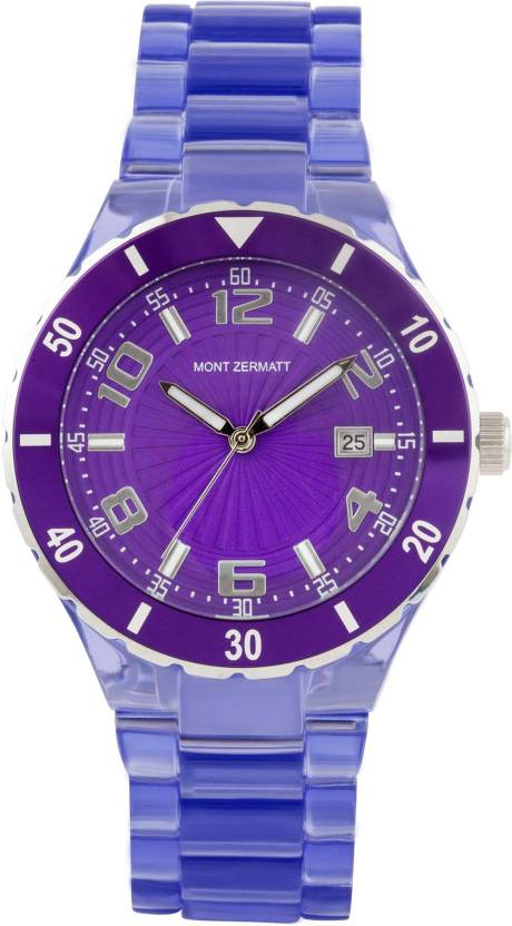 Brought too you from the house of D'SIGNER MONT ZARMATT Analog watches are quartz movement with manufacturer's warranty at affordable prices.case style:watch,case with a bazel ring Two tone Color case round shape.has a stainless steel. dial style:round shape dial color,Purple with a date window at 3.in the surface,feature: A Screw at the position of 3 to reset the time. strap style,Blue Plastic strap it has a Plastic strap which gives you a comfort in wear secured with a tang clasp water resistant up to 30 m. warranty: 1 year battery,1 year movement , and 6 month plating.