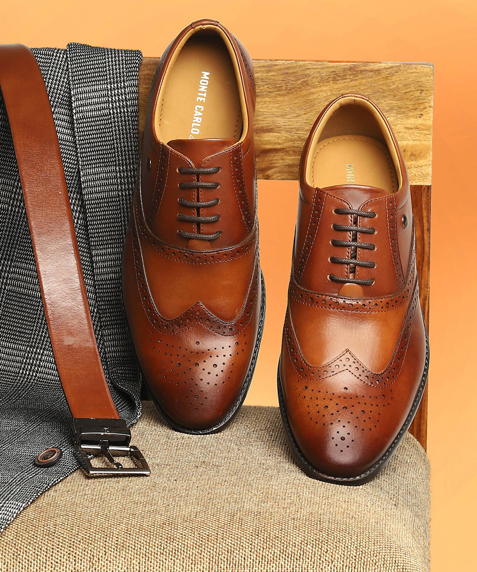 Feel classy with Monte Carlo Mens Tan Formal Brogue shoes. They have an elegant lace up design, imported top lining and a non slip sole. They have a unique heel sole effect and come with sock padding.