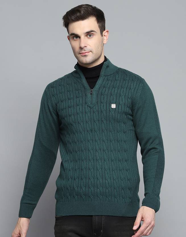 Monte Carlo Mens Self Design Green Mock Neck Full Sleeves Pullover. Made From Wool Blend Fabric.