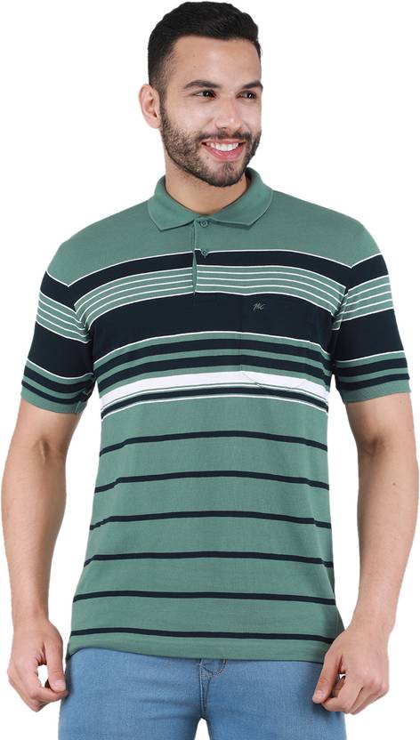 Men Striped Polo Neck Cotton Blend Green T-Shirt