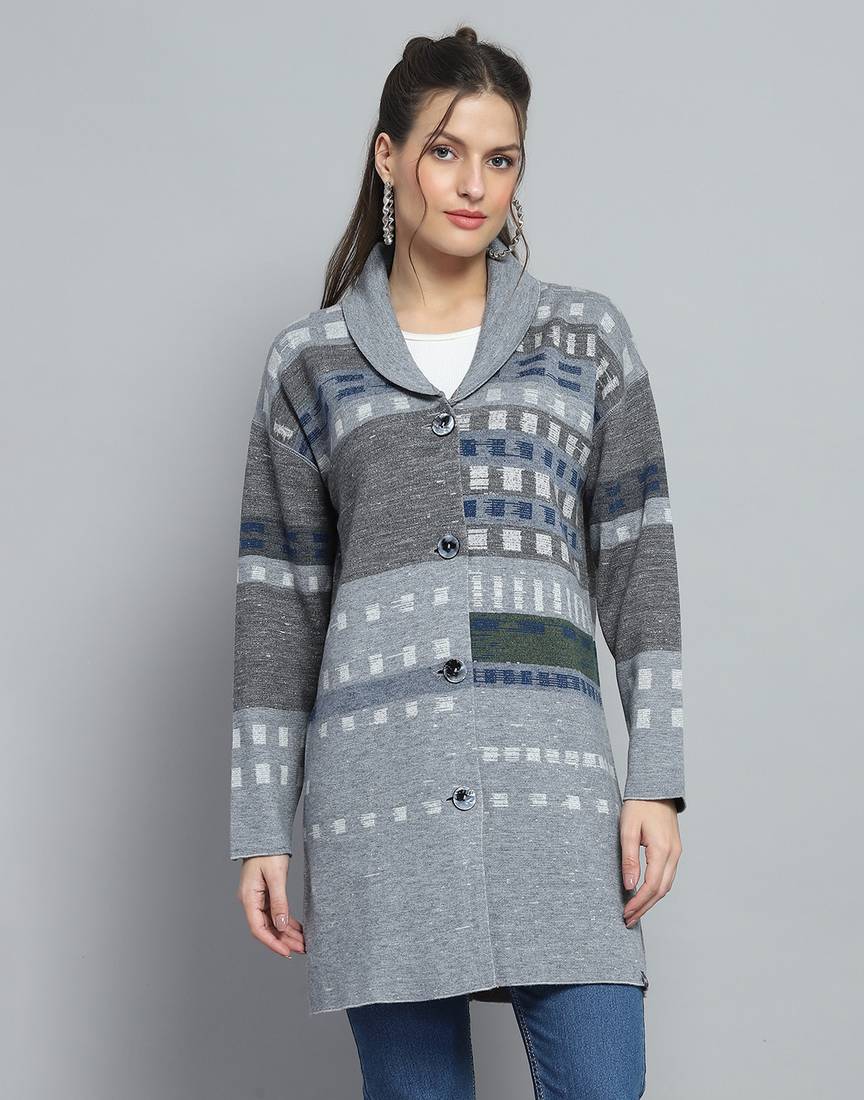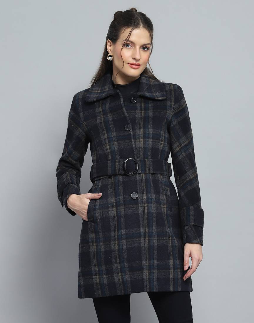 Monte Carlo Womens Check Navy Blue Collar Neck Full Sleeve Coat. Made From Wool Blend Fabric.