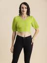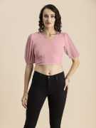 Moomaya Women's Solid Crop Top, V Neck Puff Sleeves Casual Summer Blouse