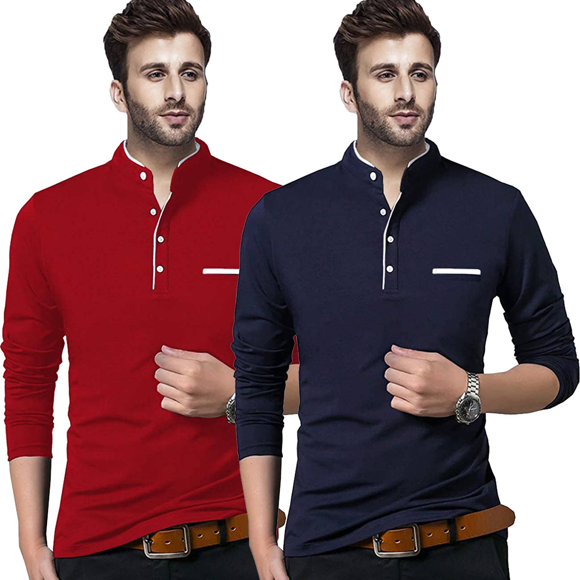 Moordale Solid Men Mandarin Collar Maroon, Blue T-Shirt