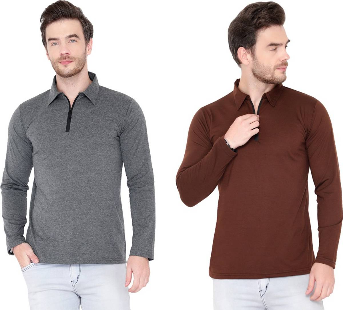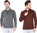 Pack of 2 Men Solid Polo Neck Cotton Blend Brown, Grey T-Shirt