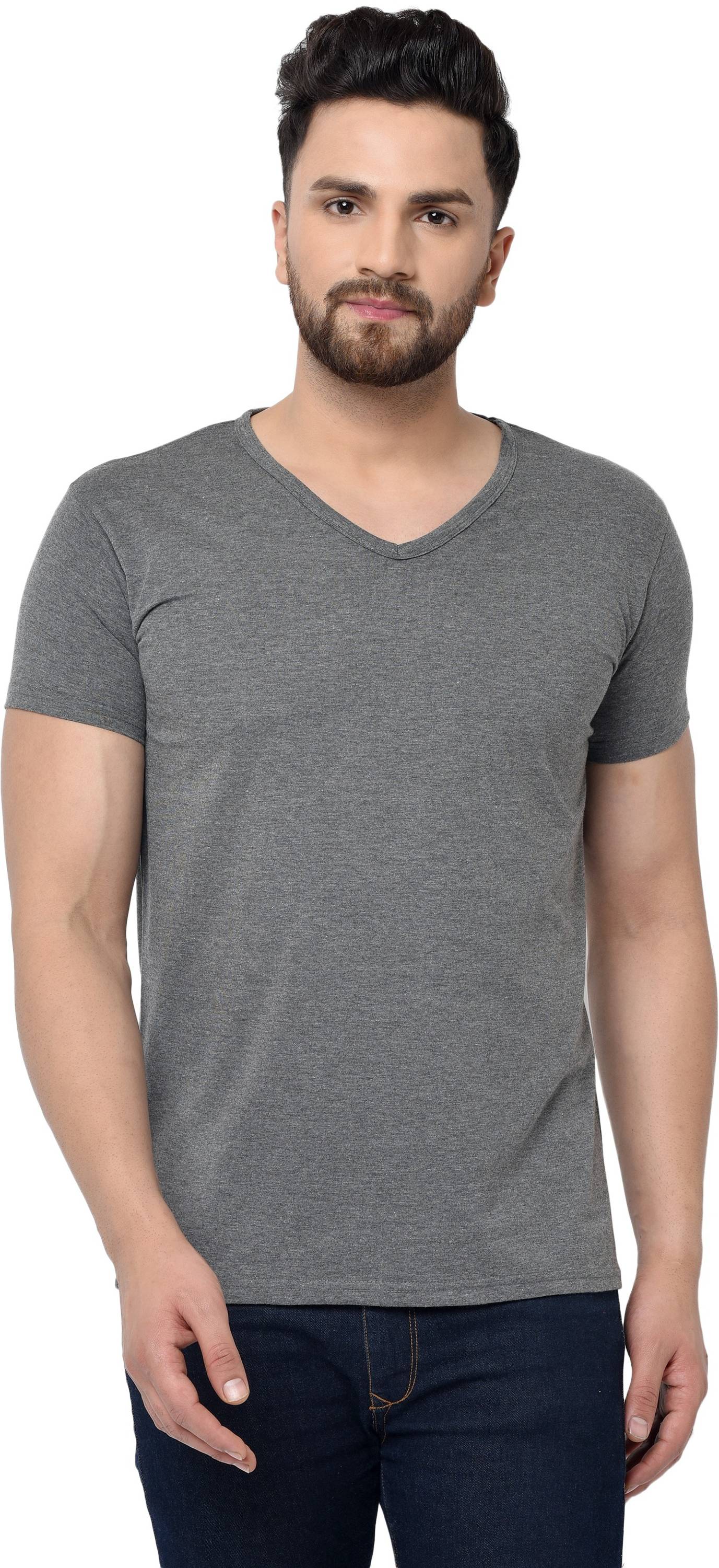 Jangoboy Men Solid V Neck Cotton Blend Grey T-Shirt