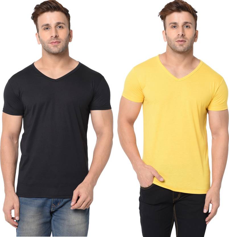 Pack of 2 Men Solid V Neck Cotton Blend Black, Yellow T-Shirt