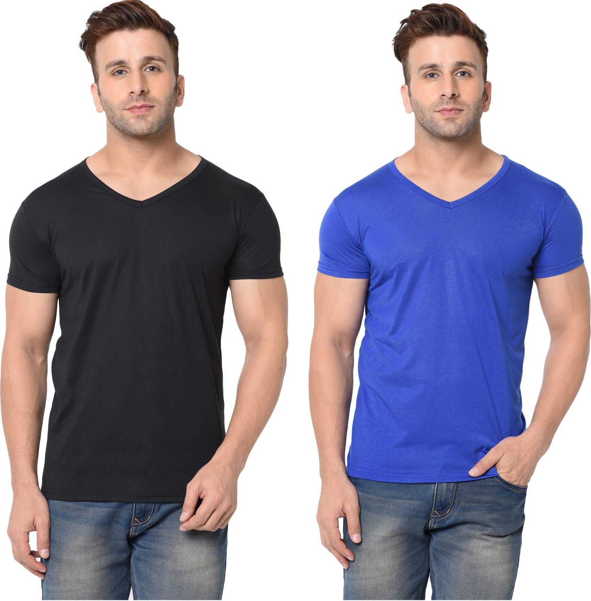 Pack of 2 Men Solid V Neck Cotton Blend Blue, Black T-Shirt
