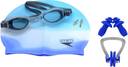 THE MORNING PLAY ™ HIGH Quality Goggles Silicone Cap 1 Nose Clip + 2 Ear Plugs BLUE-WHITE Swimming Kit