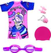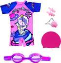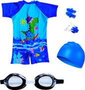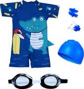 PRACTICAL SWIMWEAR: swim dress with elastic waistband and quick-dry fabric for maximum comfort during water activities, QUICK-DRY FABRIC: Made with lightweight, fast-drying material perfect for swimming and beach activities, COMPLETE SET: Includes a one-piece swimsuit, swimming cap, goggles, and ear plugs for a comprehensive swimming experience, UNISEX DESIGN: Versatile swimming costume suitable for both boys and girls, featuring a comfortable and practical design, CONVENIENCE: Easy-to-wear one-piece design with secure fit, making it perfect for swimming lessons and pool activities, ESSENTIAL ACCESSORIES: Comes with properly fitted swimming goggles and ear plugs to ensure protection during water activities, SWIM CAP INCLUDED: Features a matching swim cap to keep hair dry and reduce water resistance while swimming