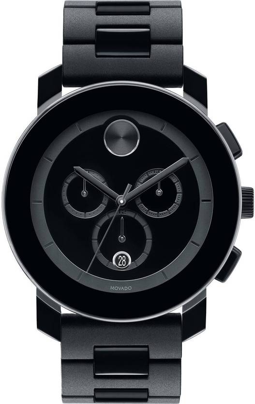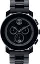 Black stainless steel case with a black tr90 resin bracelet. Fixed bezel. Black dial with black hands. The signuture movardo dot appears at the 12 o'clock position. Dial Type: Analog. Swiss quartz movement. Solid case back. Case diameter: 43 mm. Round case shape. Band width: 22 mm. Functions: chronograph, date, hour, minute, second. Dress watch style. Watch label: Swiss Made. Movado Bold Chronograph Black Bracelet Men's