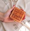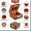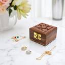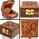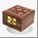 It is a small, square wooden box, and has intricate floral carvings on its top surface. The box exudes a rustic charm with natural wood through its rich, dark brown colour and polished finish.