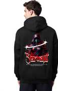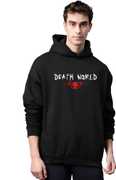 Embrace the edgy and dark allure of our"Anime-Inspired Hoodie!"This black hoodie features a striking Death World graphic design on both the front and back, perfect for anime lovers and fans of unique streetwear. The back showcases a bold and intense skull graphic with a haunting figure, while the front sports a minimalist red skull logo and "Death World" text in distressed white font.