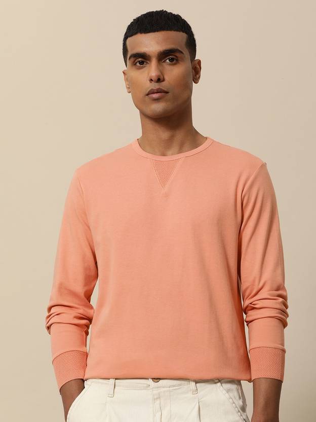 Peach-coloured Tshirt for menSolidRegular lengthRound neckLong, regular sleevesKnitted pure cotton fabricComes with a field notebooknbsp;.