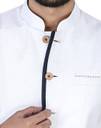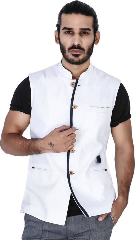 White Linen Nehru Jacket With Flap& Piping Detail Solid Men Waistcoat