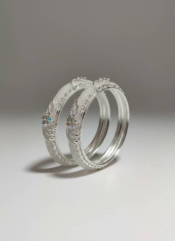 Enhance your ethnic and party look with this premium designer silver plated kada bangles set of 2, crafted with sparkling stone studded detailing and elegant floral patterns. These luxury imitation bangles for women offer a rich bridal and royal look, perfect for weddings, receptions, parties, festivals, engagements, and special occasions.