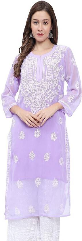 The Chikankari embroidered A-line kurta for women, crafted from georgette fabric, is a beautiful blend of traditional craftsmanship and modern style. This kurta features intricate embroidery on the neckline, sleeves, and back, showcasing of fine chikan work. The lightweight and flowy nature of the georgette fabric ensures comfort and elegance, making it an ideal choice for both casual and formal occasions. The detailed embroidery enhances the overall look, making this kurta a stunning addition to any wardrobe. Suitable during summer and spring sessions. Comfortable and ease of movement all of day specially for working women and girls. Kurti if paired with jeans, pant, sharara and palazzo etc. creates a graceful and trendy look for fashionable women and girls.