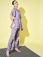 Boasting a traditional Angrakha-styled fit with a V-neckline and bell sleeves, the kurti from this set combines an elegant silhouette with a relaxed look. Moreover, its classic tie-up design enhances fit while ensuring adjustability. Furthermore, the pants’ elasticated waistline offers a secure yet comfortable fit, and the bell-bottom style promotes a vintage silhouette. Collectively, this set creates a unique as well as comfortable outfit.