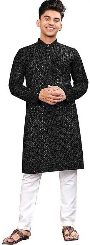 Men Embroidered Cotton Blend Straight Kurta (Black)
