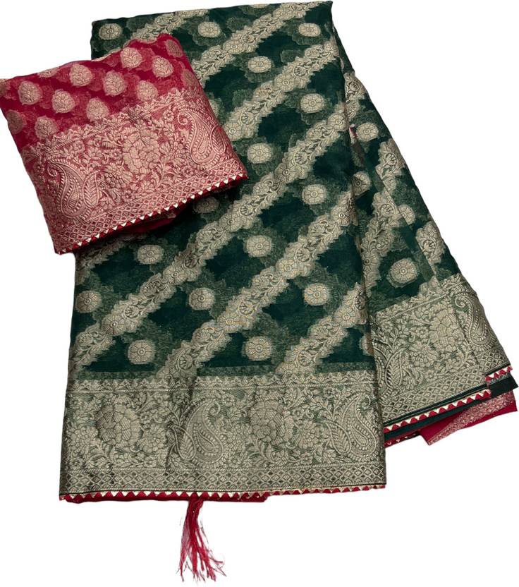 Woven, Self Design Banarasi Art Silk, Organza Saree (Dark Green, Red)