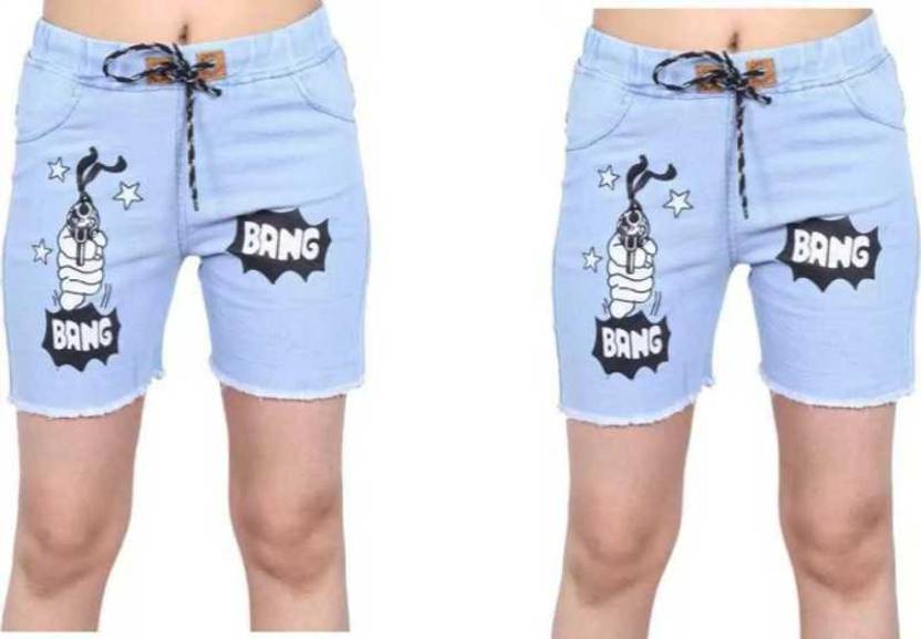 muazgoo Printed Women Denim Light Blue Denim Shorts