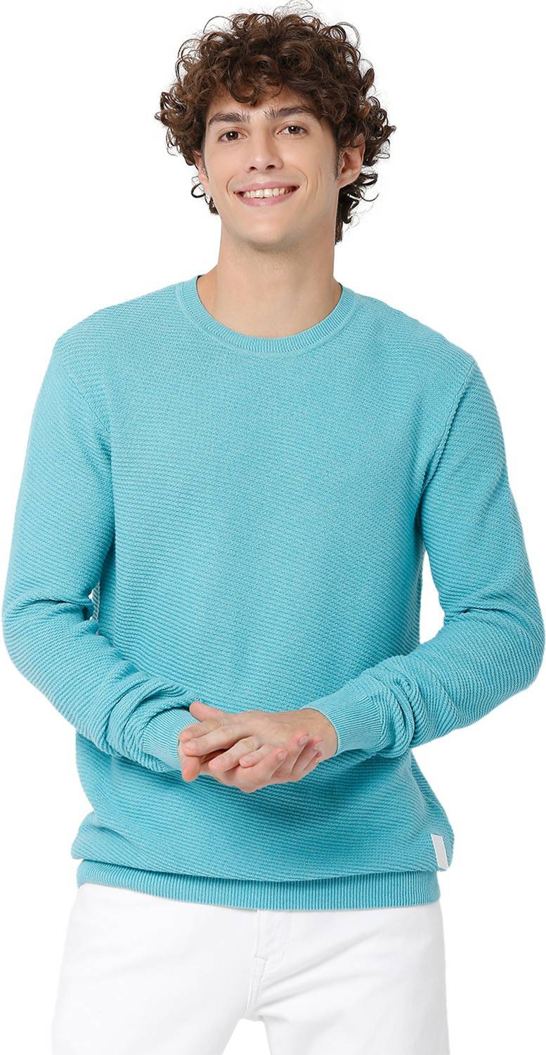 MUFTI Solid Round Neck Casual Men Blue Sweater