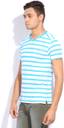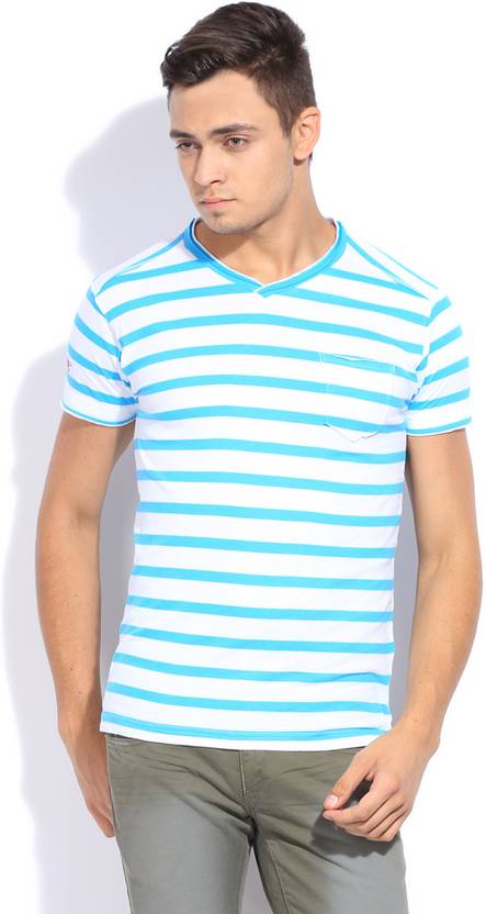 MUFTI Men Striped V Neck Cotton Blend White, Blue T-Shirt