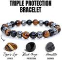 Triple Protection Bracelet This Triple Protection Tiger's Eye, Hematite, Black Onyx Bracelet combines in one jewel the most powerful protective stones and is remarkable for its sublime colors. This Bracelet can be wear by girls men boys ladies. SPECIFICATION Beads Size: 8mm Length: 19-20 cm Total 24 Beads Elastic band ensures good fit on all wrist size Activate your inner power by combining these three stones bracelet of power, protection and balance. Feel a deep sense of inner strength and protection. This is the perfect gift for women as a bangle and gift for boy friend as bracelets jewellery.