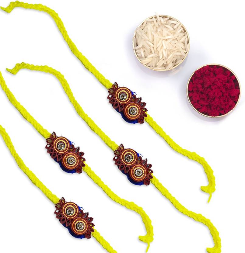 Roli, Chawal, Set of 4 Red Yellow Handmade Craft Paper Rakhi