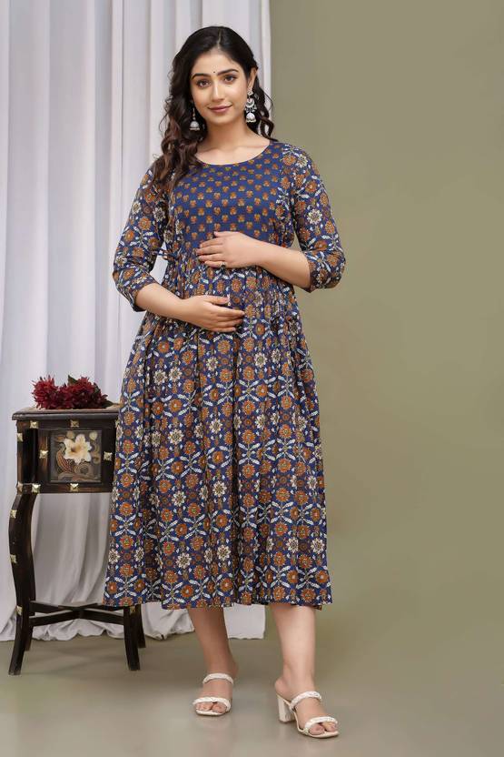Experience comfort and elegance with this beautifully designed maternity A-line gown, crafted from soft and breathable cotton fabric. The floral print adds a touch of charm, while the front buttons and gathered waist provide ease and flexibility during and after pregnancy. Perfect for casual outings, home wear, or maternity photoshoots, this gown combines style and functionality for every mom-to-be.