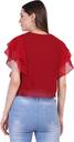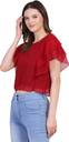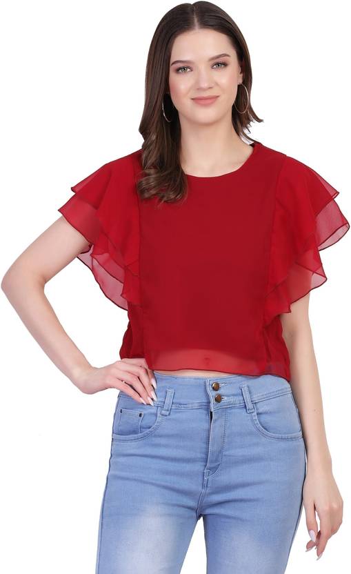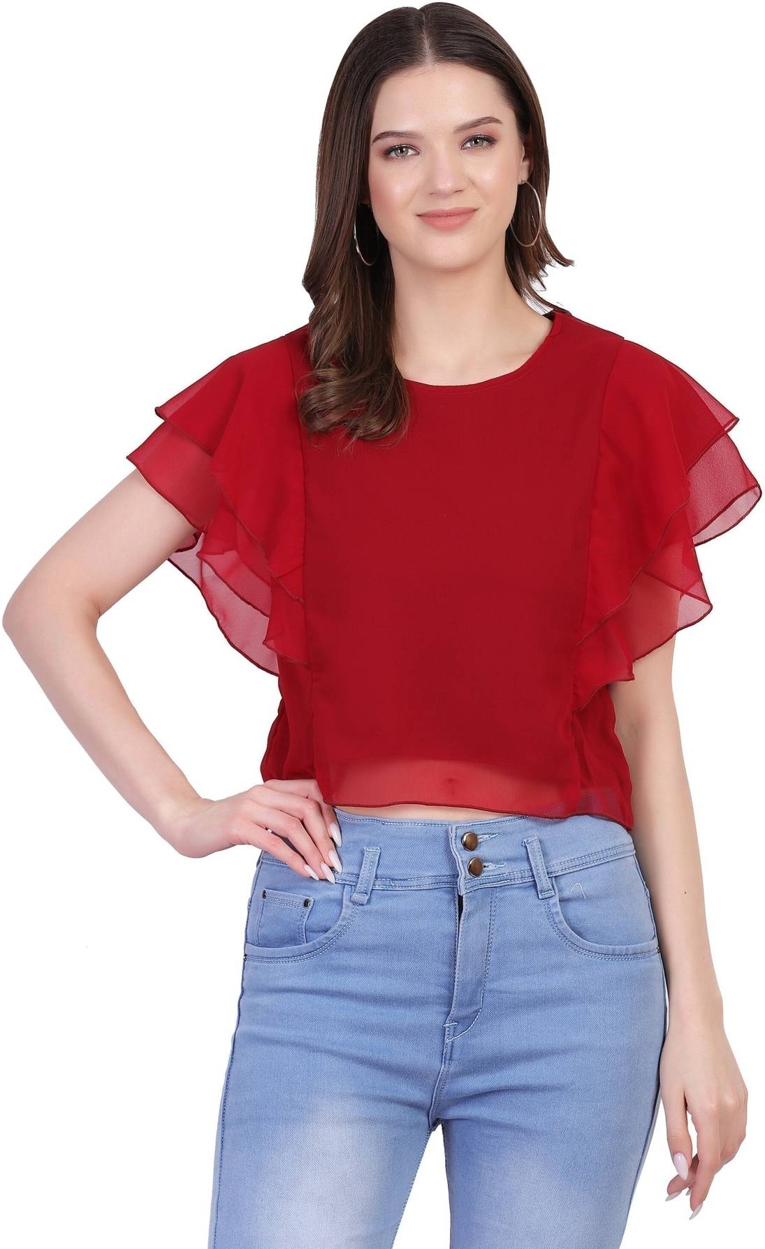 First arrival; Elevate your western wear collection with this top designed for the modern woman. The standout feature is its elegant ruffle sleeves crafted with sheer overlay, adding a touch of feminine charm to the classic silhouette. The round neckline keeps the look versatile, while the relaxed fit ensures all-day comfort. Perfect for both casual outings and semi-formal occasions, this top pairs beautifully with jeans, trousers, or skirts. The subtle yet stylish design makes it an excellent choice for office wear or weekend brunches. The black colour offers maximum versatility in styling, while the ruffle detail adds movement and grace to your ensemble. This top combines contemporary fashion with practical comfort, making it a must-have addition to your wardrobe.