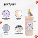 • Stretchable Design: Fits most standard baby bottles from 60ml to 125ml., Soft Hosiery Fabric: Gentle on baby’s hands and helps maintain bottle warmth., Easy-to-Hold Strap: Convenient strap makes it easier to carry and prevents slipping., Cute Embroidered Patch: Attractive cartoon design adds fun to feeding time., Protective Cover: Shields bottles from scratches and dirt while on the go., Washable & Reusable: Easy to clean and long-lasting for everyday use., Perfect for Travel: Lightweight and portable – ideal for diaper bags or strollers., Ideal Gift Option: Great for baby showers, new moms, and newborn essentials.